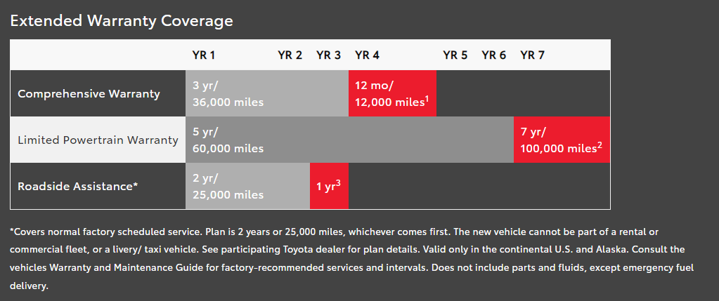 Along with industry-leading heritage comes another advantage; an exceptional coverage policy. With a 12-month/12,000-mile Limited Comprehensive Warranty[1] a 7-year/100,000-mile Limited Powertrain Warranty[2] plus one full year of Roadside Assistance[3], honored at more that 1,400 Toyota dealers in the U.S. and Canada, we've got you covered.